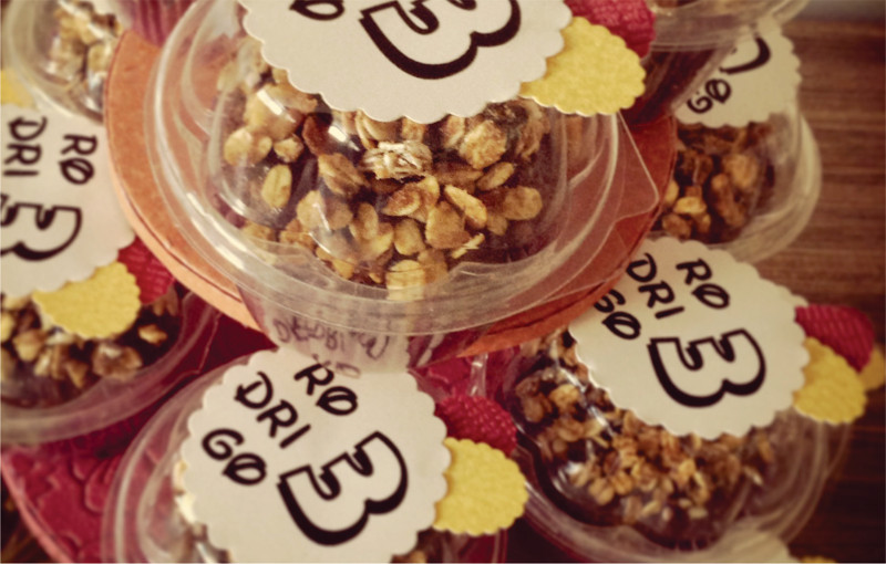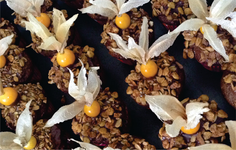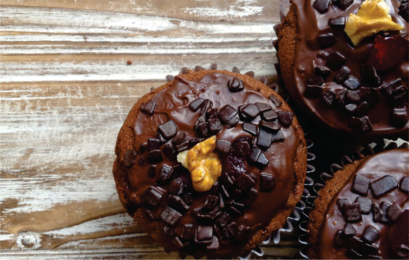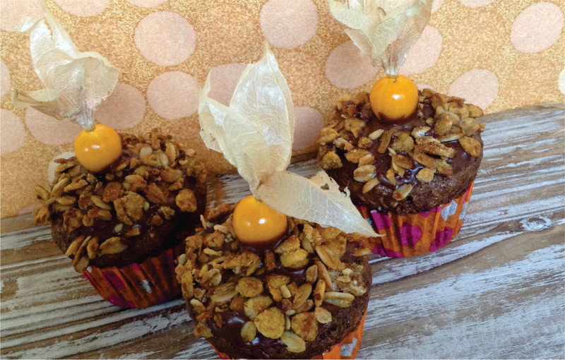 | Massa com bananas maduras, castanhas de caju torradas, cocô em flocos, açúcar mascavo, cacau, passas e especiarias. Cobertos com chocolate e granola. | ||