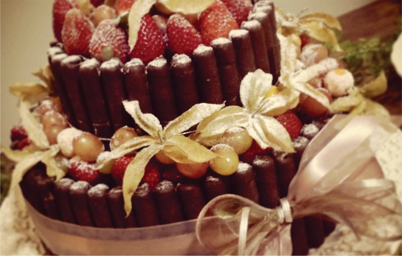 | Bolo pelado com massa molhadinha, recheio de creme de baunilha com damascos, coberto com damascos recheados com chocolate, uvas e açúcar gelado. | |||