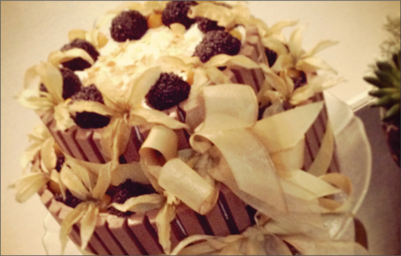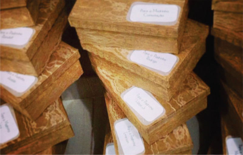 | Caixinha de chocolate, creme de confeiteiro, macadâmia, amendoa, castanhas e cereja com cabinho. | ||