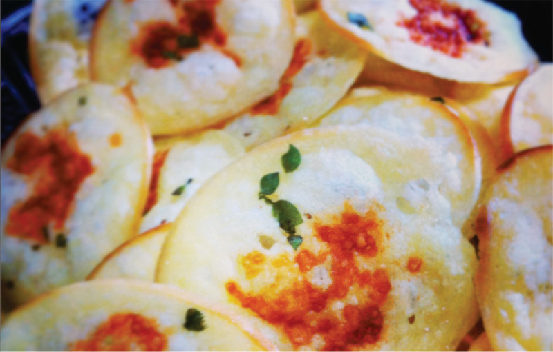 | Queijo provolone em rodelas finas e crocantes com um toque de manjericão. |