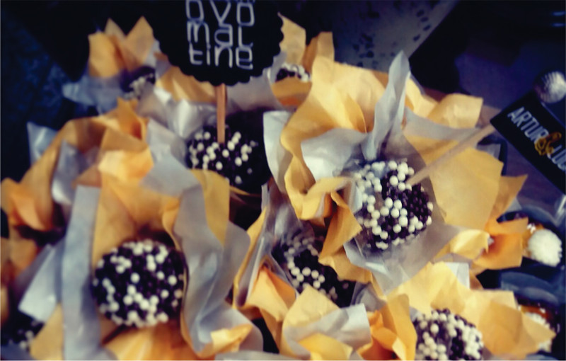 | Descartável em forma de colher com brigadeiro especial e confeito belga. | ||