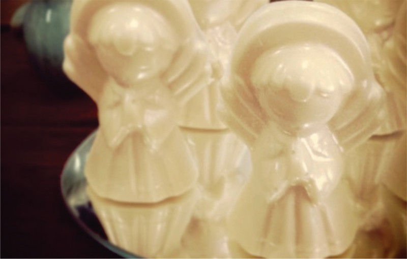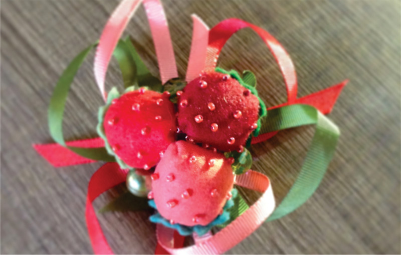 | Casquinha de chocolate branco, geléia de morango e gota de chantininho. | ||