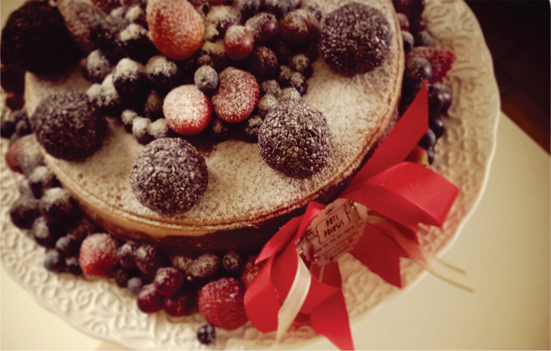 | Bolo pelado com massa molhadinha, recheio de creme de ovomaltine, coberto com ganache blend, morangos e mirtilos. | |||