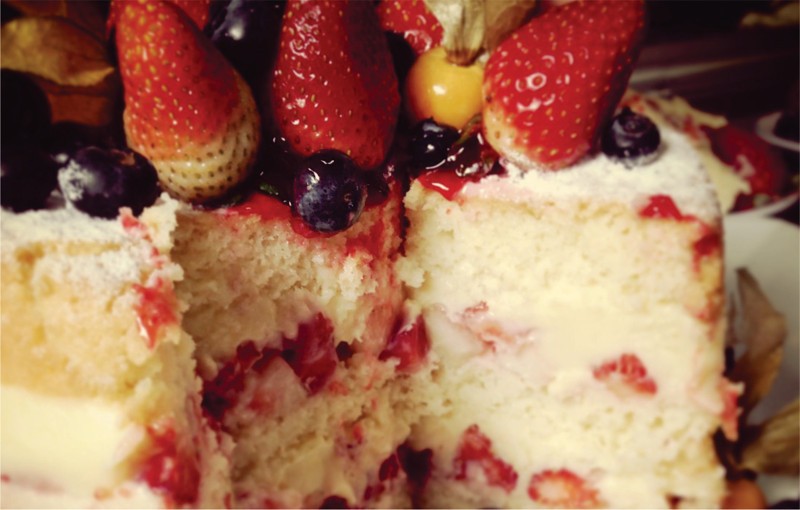 | Bolo pelado com massa molhadinha, recheio de creme de baunilha com morangos, coberto com morangos, uvas e açúcar gelado. | |||