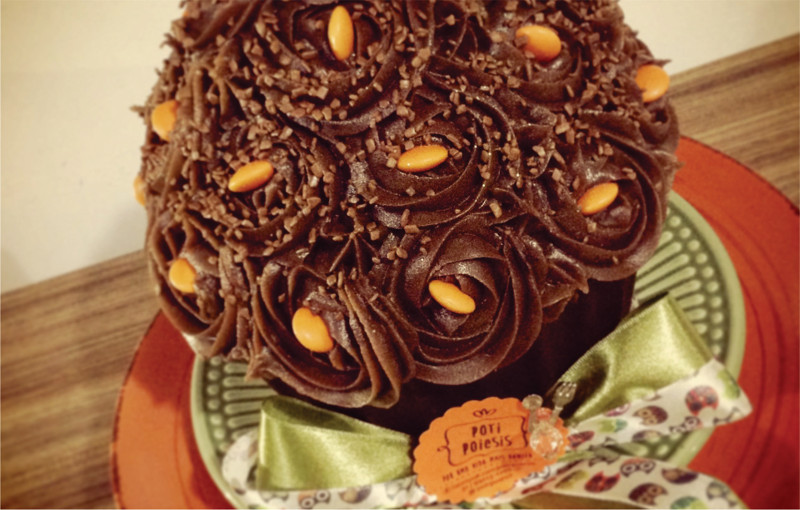 | Massa amanteigada de chocolate, recheio de chocolate e cobertura de chantilly de chocolate com confeitos. | ||